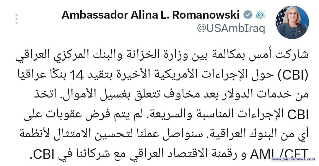 وقالت رومانوسكي في تغريدة عبر تويتر : " شاركت أمس بمكالمة بين وزارة الخزانة والبنك المركزي العراقي (CBI) حول الإجراءات الأمريكية الأخيرة بتقيد 14 بنكا عراقيًا من خدمات الدولار بعد مخاوف تتعلق بغسيل الأموال".