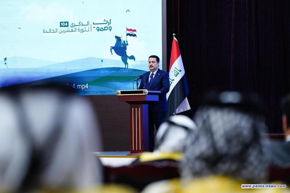 وأشار رئيس مجلس الوزراء ، خلال رعايته الحفل الرسمي الذي أقيم في العاصمة بغداد بمناسبة الذكرى 104 لثورة العشرين، إلى أن صناعةَ التاريخ لم تحدث في مكان من هذا العالمِ كما حدثت هنا بين النهرين، مشيراً إلى أنه، عبر مئة عامٍ مضت من التحوّلات والتفاعلات، ترتبط جذور الوعي بثورةِ العشرين، وبفكرتها التي انبثقت منها معاني الوطنيةِ الحديثة، وبرموزها المؤسسين لمفاهيم مناهضة قوى الاستعمارِ والهيمنةِ آنذاك"