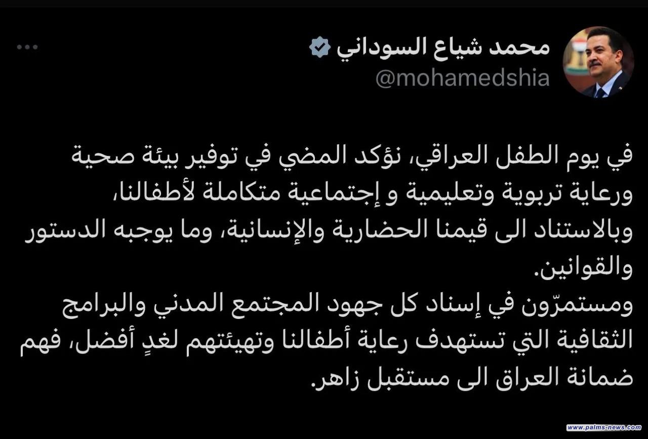 وقال السوداني في تدوينة له على منصة (x) "في يوم الطفل العراقي، نؤكد المضي في توفير بيئة صحية ورعاية تربوية وتعليمية واجتماعية متكاملة لأطفالنا، وبالاستناد الى قيمنا الحضارية والإنسانية، وما يوجبه الدستور والقوانين"