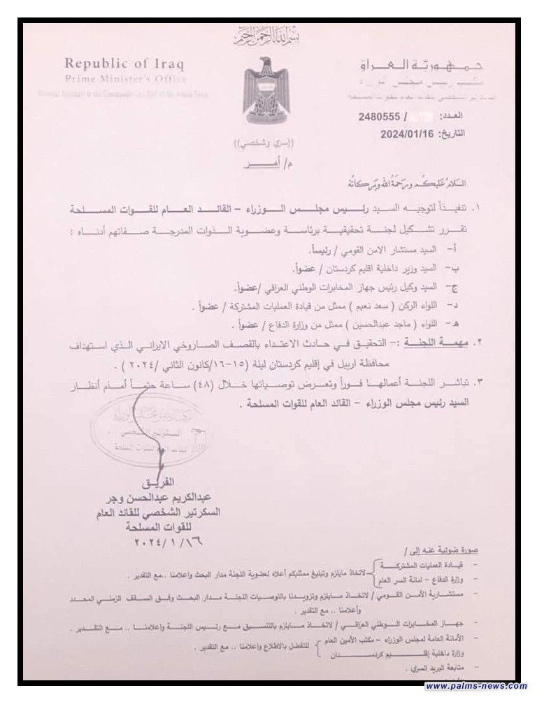 وبينت الوثيقة، أن مهمة اللجنة التحقيق في حادث الاعتداء بالقصف الصاروخي الذي استهدف محافظة اربيل في اقليم كوردستان ليلة (15-16) كانون الثاني 2024، على أن تباشر اللجنة أعمالها فوراً وتعرض توصياتها خلال (48) ساعة أمام رئيس الوزراء.
