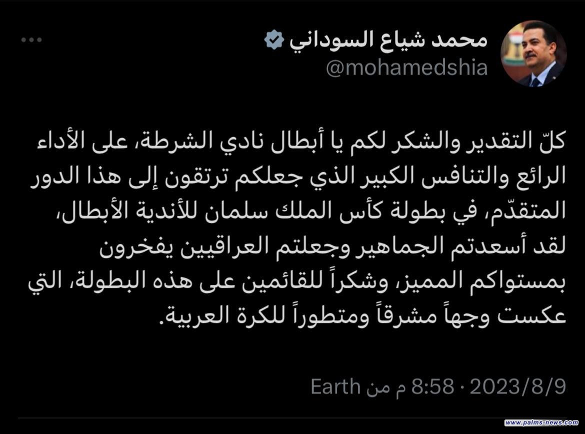 السوداني يشيد بنادي الشرطة ويشكرهم على الأداء الرائع والتنافس الكبير