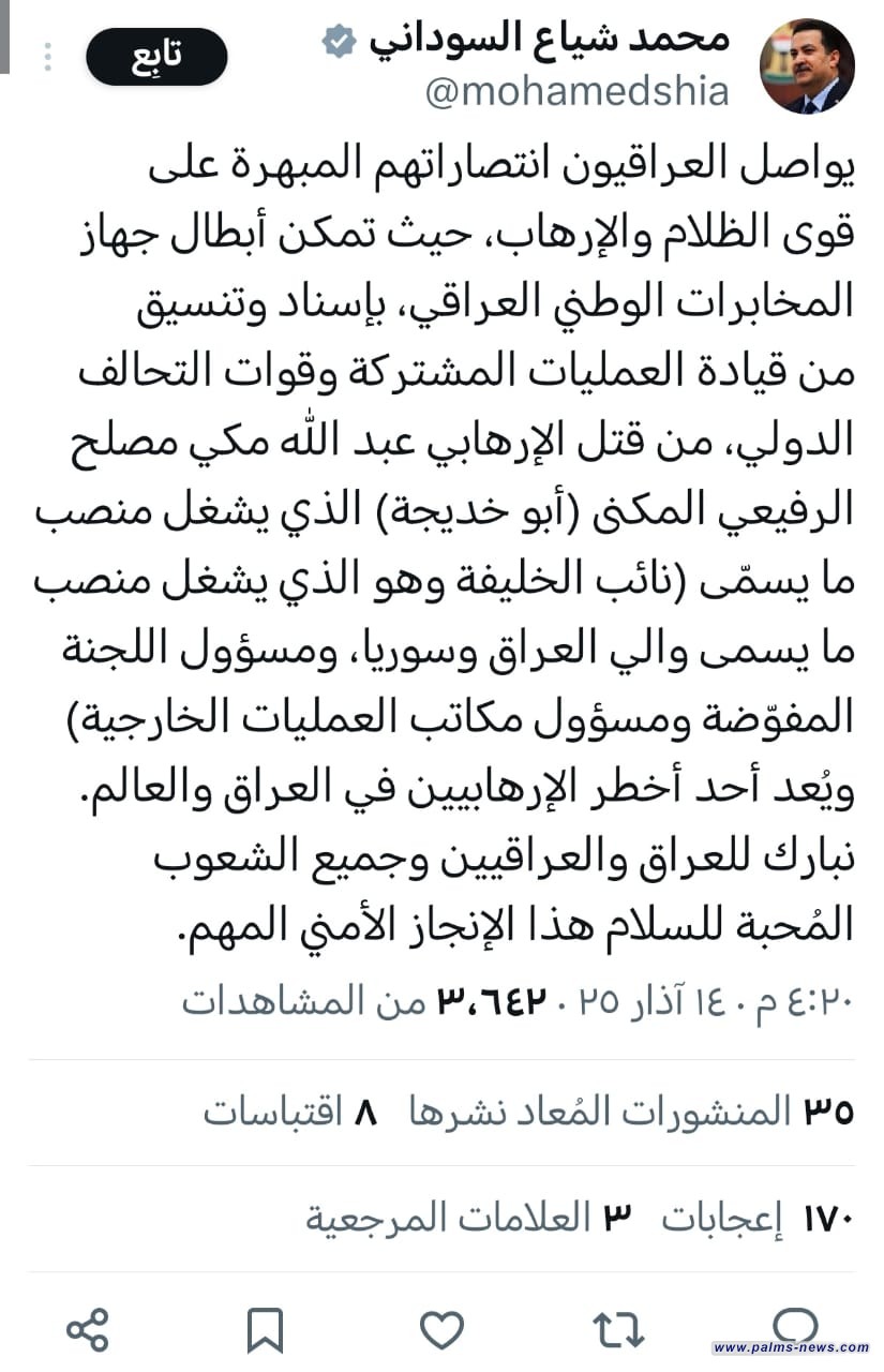 السوداني يعلنُ مقتل والي العراق و سوريا، الإرهابي (أبو خديجة)