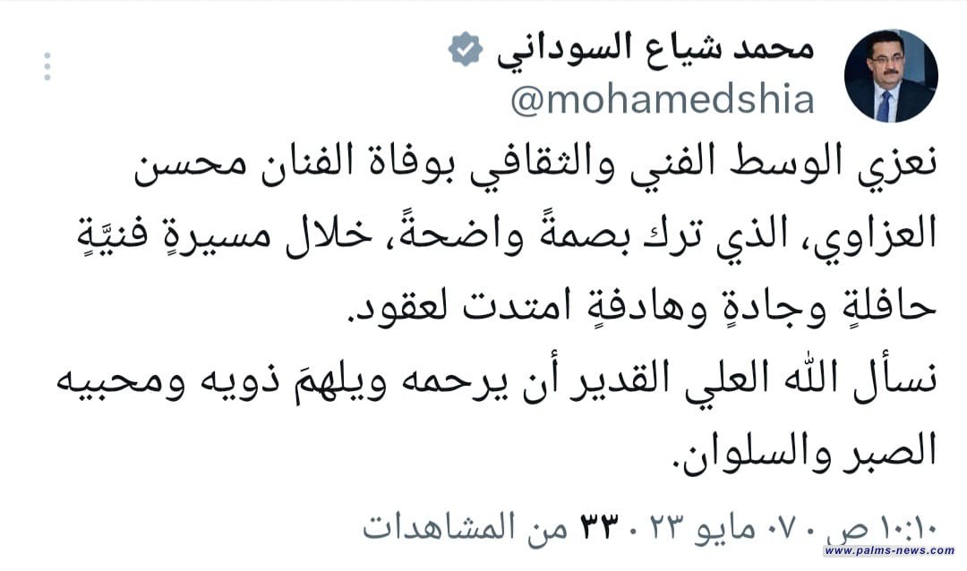 وقال السوداني في تغريدة له على تويتر :"نعزي الوسط الفني والثقافي بوفاة الفنان محسن العزاوي، الذي ترك بصمةً واضحةً، خلال مسيرةٍ فنيَّةٍ حافلةٍ وجادةٍ وهادفةٍ امتدت لعقود، نسأل الله العلي القدير أن يرحمه ويلهمَ ذويه ومحبيه الصبر والسلوان".