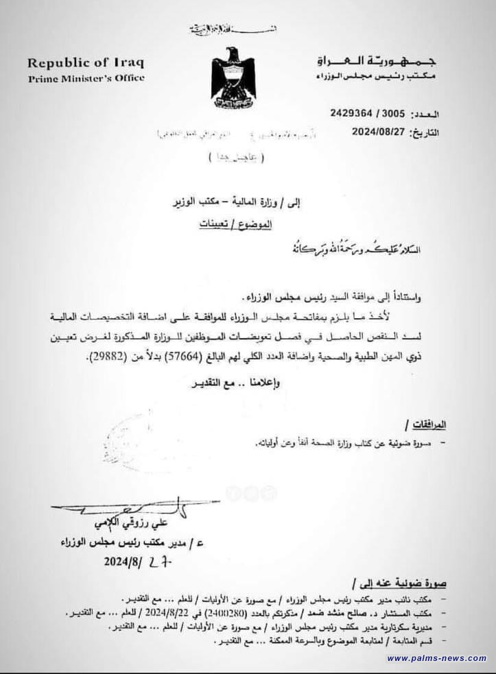 وبحسب وثيقة صادرة عن مكتب رئيس الوزراء وموجهة إلى وزارة المالية تابعتها وكالتنا ، فأن السوداني وجه الوزارة بمفاتحة مجلس الوزراء للحصول للموافقة على إضافة التخصيصات المالية اللازمة لسد النقص في الدرجات الوظيفية لذوي المهن الطبية والصحية".