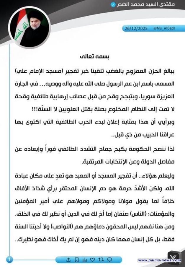 علق زعيم التيار الوطني الشيعي، السيد مقتدى الصدر، اليوم الجمعة، على حادثة تفجير مسجد الامام علي (ع) بحمص السورية، فيما وجه رسالة الى الحكومة السورية.