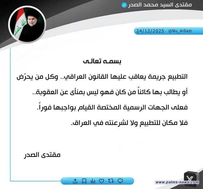 وقال الصدر في تغريدة له: "التطبيع جريمة يعاقب عليها القانون وكل من يحرض أو يطالب بها كائنا من كان فهو ليس بمنأى عن العقوبة"