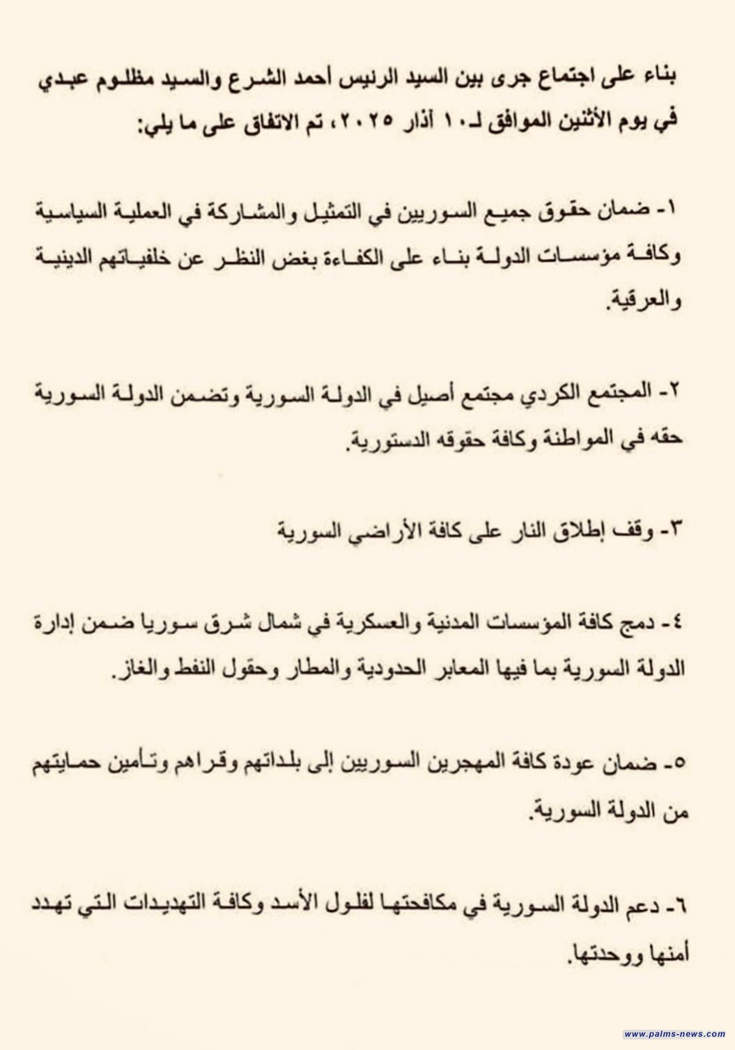 أعلنت الرئاسة السورية توقيع اتفاق يقضي باندماج قوات سوريا الديمقراطية ضمن مؤسسات الدولة، والتأكيد على وحدة الأراضي السورية ورفض التقسيم.