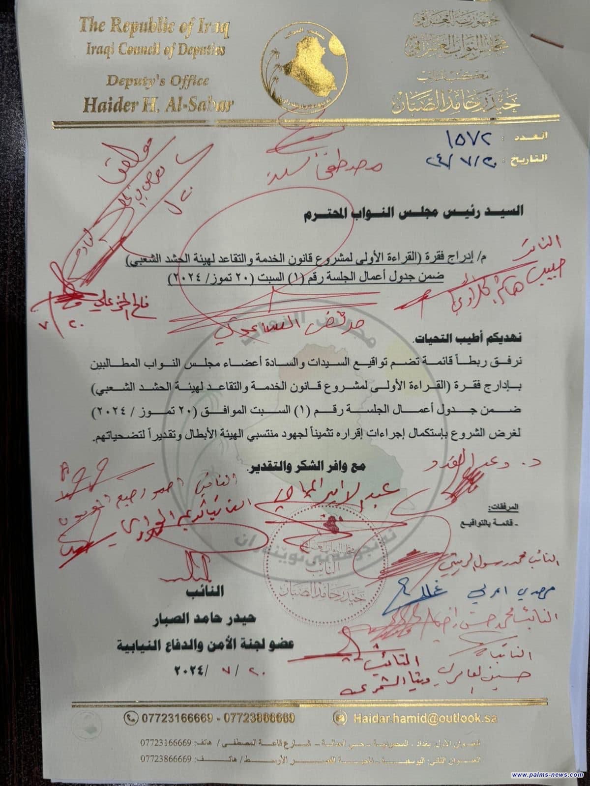 أعلن النائب حيدر حامد الصبار اليوم السبت العشرين من تموز، أنه استحصل موافقة رئاسة مجلس النواب على إدراج مشروع قانون الخدمة والتقاعد لهيئة الحشـد الشعبي ضمن جدول أعمال الجلسة القادمة لغرض قرائته قراءة أولى لإستكمال إجراءات إقرار القانون المذكور تثمنيًا لجهود منتسبي الهيئة الأبطال.