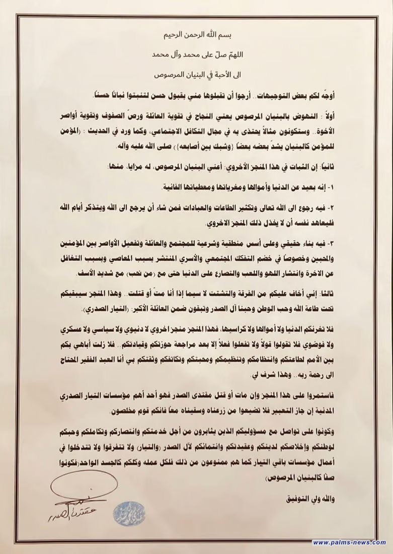 أصدر زعيم التيار الصدر، مقتدى الصدر، اليوم الأحد، ثلاث توجيهات إلى أفراد مشروع البنيان المرصوص، حيث دعا إلى النهوض بالمشروع والثبات عليه. وفي سياق ذلك، أعرب عن قلقه من فرقة وتشتت أفراد المشروع، وأشار إلى خوفه من حدوث تشتيت في صفوفهم في حال حدوث وفاته أو تعرضه للقتل.
