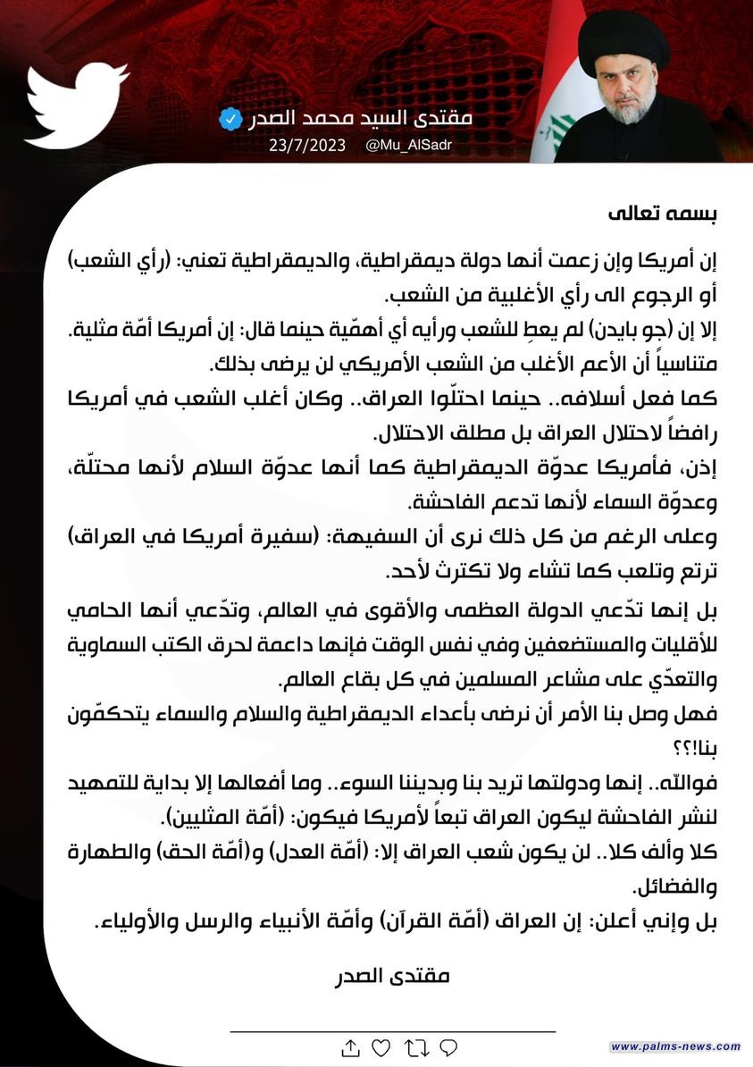 الصدر: لن نرضى  لأعداء الديمقراطية والسلام و السماء أن يتحكموا بنا
