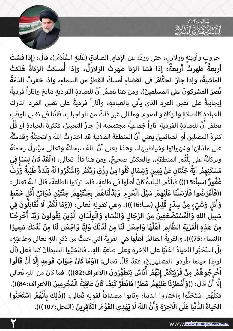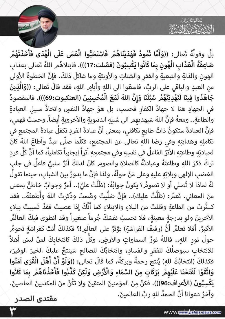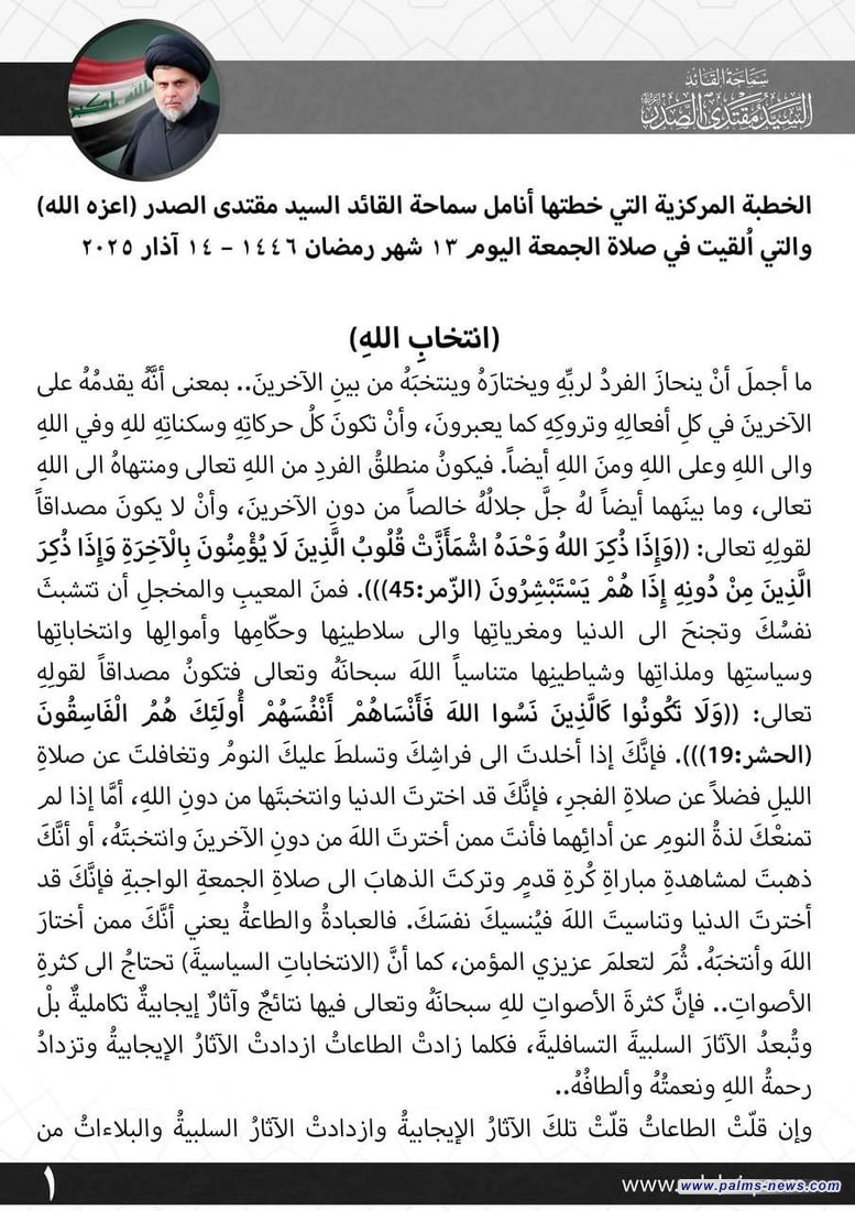 الصدر يحذر من الغضب الإلهي ويدعو إلى “انتخاب الله” ومغادرة مفردة “ظلت علي”