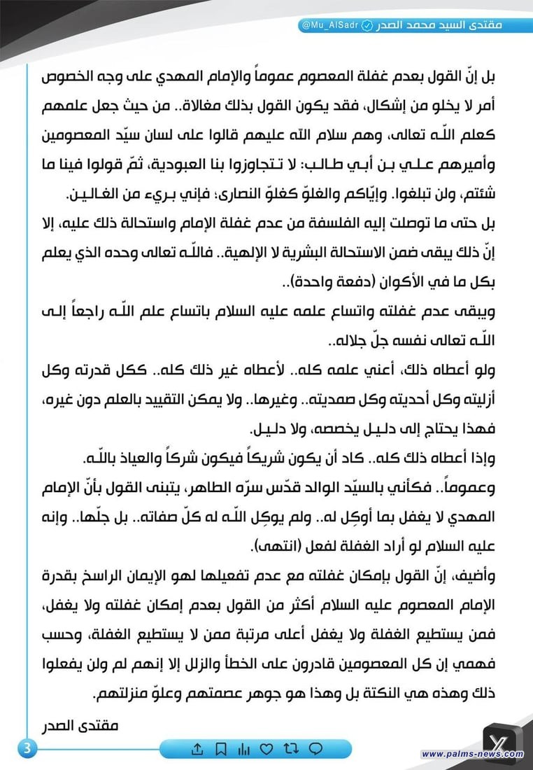 الصدر يرد على "عمائم لندن".. يمكن للمعصوم أن يخطئ ولكن للغفلة 3 أنواع