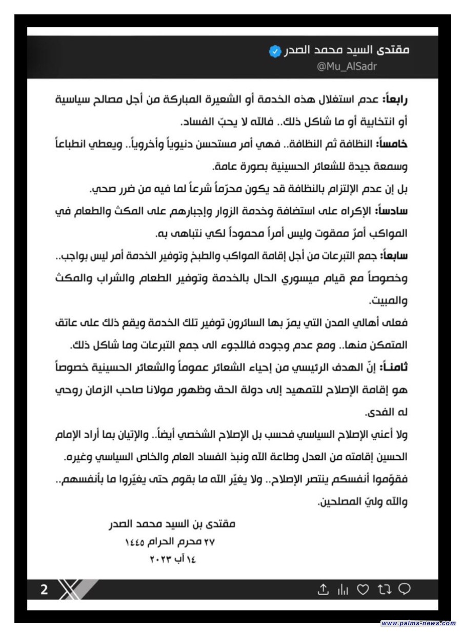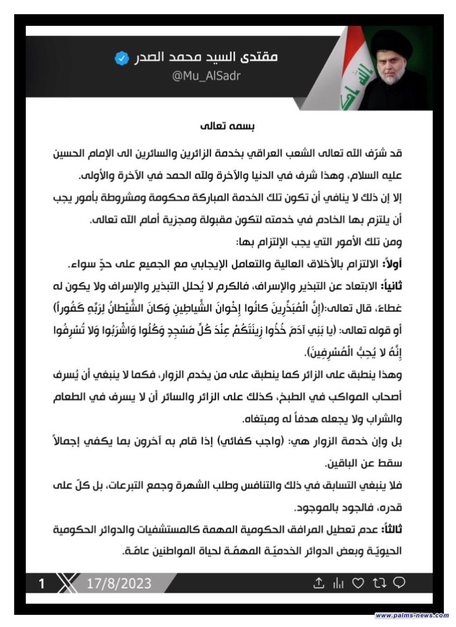 الصدر يطرح 8 شروط قبول "خدمة" زائري الإمام الحسين (ع)