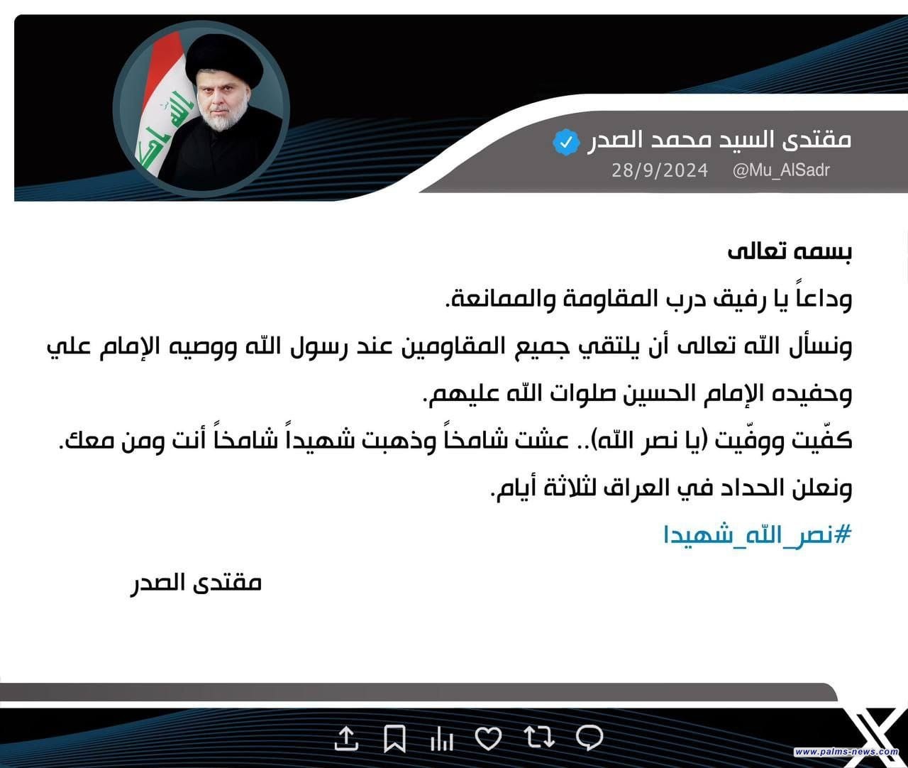 غرد زعيم التيار الصدري السيد مقتدى الصدر عبر صفحته في منصة x - تويتر سابقا - بكلمات مقتضبة أعلن فيها الحداد ثلاثة أيام في العراق على استشهاد الأمين العام لحزب الله السيد حسن نصر الله.