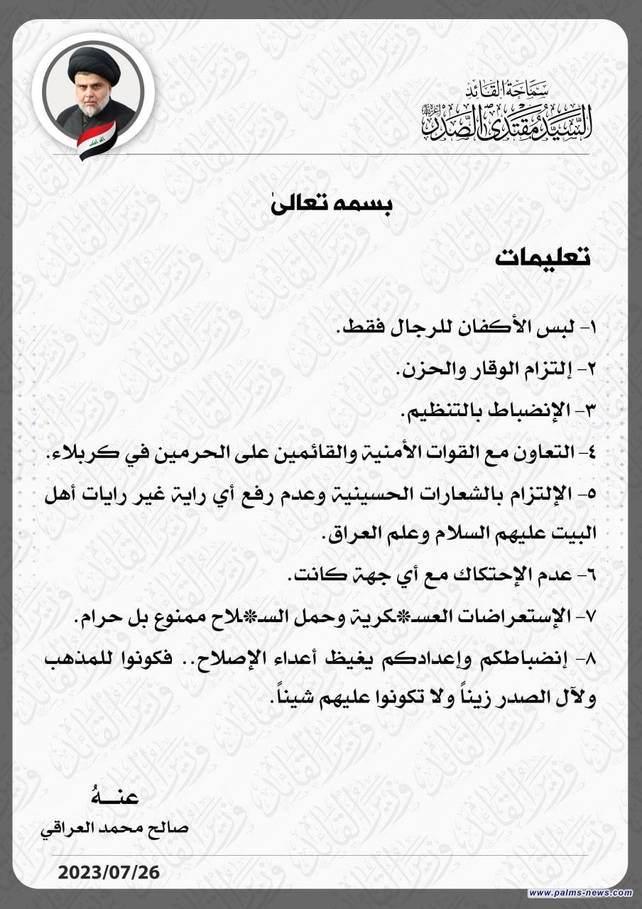 الصدر ينشر8 تعليمات لإحياء ذكرى عاشوراء منها منع الاستعراضات العسكرية وحمل السلاح