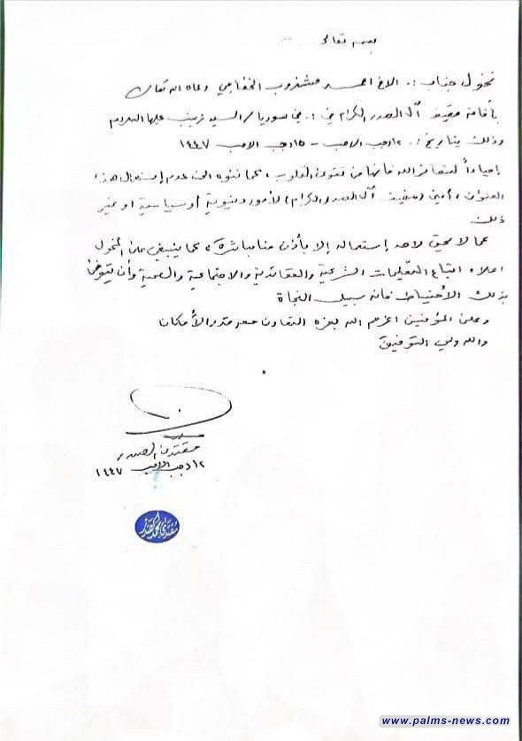 وكلّف الصدر - بحسب بيان صادر عن مكتبه - "مشذوب الخفاجي" بافتتاح "مضيف آل الصدر الكرام" في سوريا في منطقة السيدة زينب بالعاصمة دمشق.