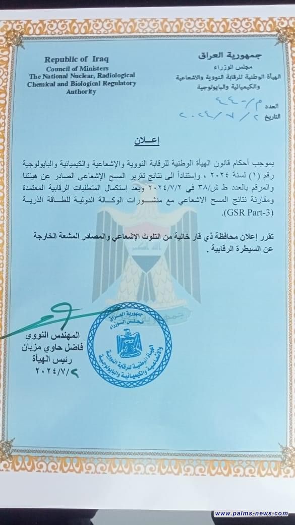 وأشار العبودي إلى أن "الفرق الرقابية من الهيأة الوطنية للرقابة النووية والإشعاعية والكيميائية أجرت مسوحاتها اللازمة التي أثبتت خلو محافظة ذي قار من المخلفات الإشعاعية"