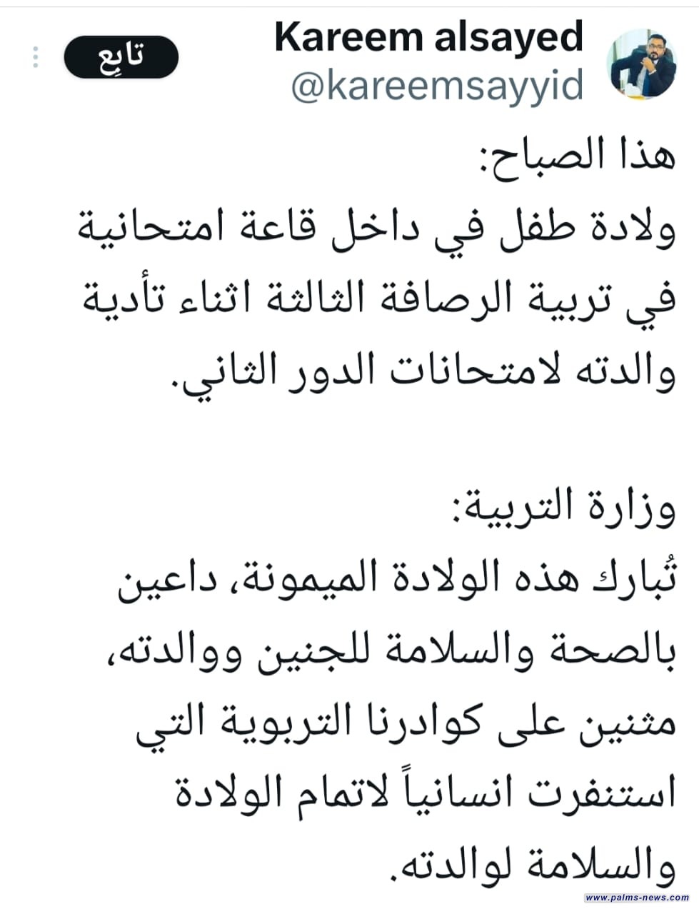 وقال المتحدث باسم وزارة التربية العراقية كريم السيد في منشور على منصة "X": "هذا الصباح شهد ولادة طفل في داخل قاعة امتحانية في تربية الرصافة الثالثة في أثناء تأدية والدته لامتحانات الدور الثاني".