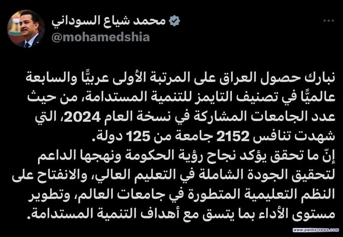 وقال السوداني، في تدوينة له عبر منصة ( x) إن ما تحقق يؤكد نجاح رؤية الحكومة ونهجها الداعم لتحقيق الجودة الشاملة في التعليم العالي.