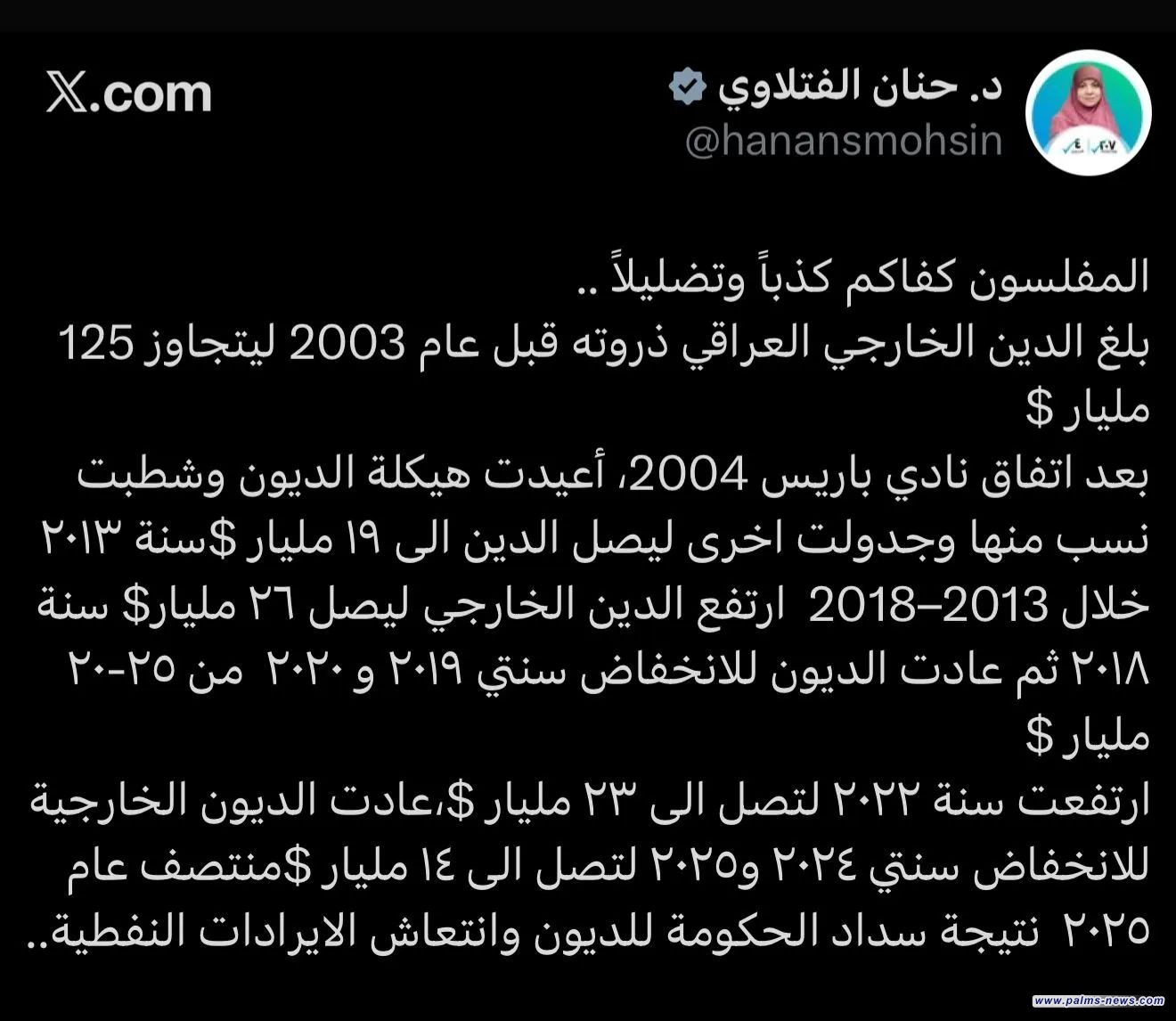 وأضافت الفتلاوي، في تدوينة نشرتها على منصة “""إكس"أن هناك ادعاءات كاذبة بشأن حجم الدين الخارجي، مؤكدة أن الدين بلغ ذروته قبل عام 2003، متجاوزاً 125 مليار دولار.