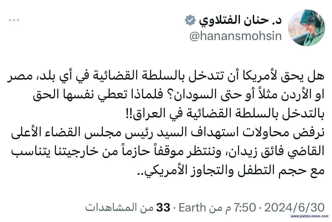 وتساءلت الفتلاوي، في تدوينة لها على منصة "x" بالقول "هل يحق لأمريكا أن تتدخل بالسلطة القضائية في أي بلد، مصر أو الأردن مثلاً أو حتى السودان؟ فلماذا تعطي نفسها الحق بالتدخل بالسلطة القضائية في العراق!!"