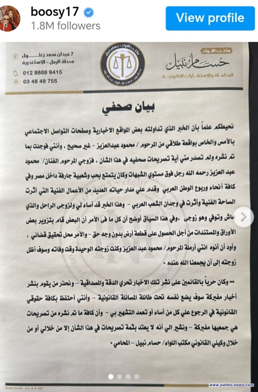 نفت الإعلامية بوسي شلبي ما تردد عبر مواقع التواصل الإجتماعي حول إنفصالها عن زوجها النجم الراحل محمود عبد العزيز قبل وفاته، من خلال نشر بيان رسمي وصور لبطاقتهما تؤكد عدم الإنفصال وكذب ما تردد؛ وذلك من خلال حسابها الشخصي على موقع الصور والفيديوهات "إنستغرام"، حيث جاء في البيان الذي نشرته بوسي شلبي: "نحيطكم علمًا بأن الخبر الذي تداولته بعض المواقع الاخبارية وصفحات التواصل الاجتماعي بالأمس والخاص بواقعة طلاقي من المرحوم محمود عبدالعزيز غير صحيح، وأنني فوجئت بما تم نشره ولم تصدر مني أية تصريحات صحفيه في هذا الشأن".