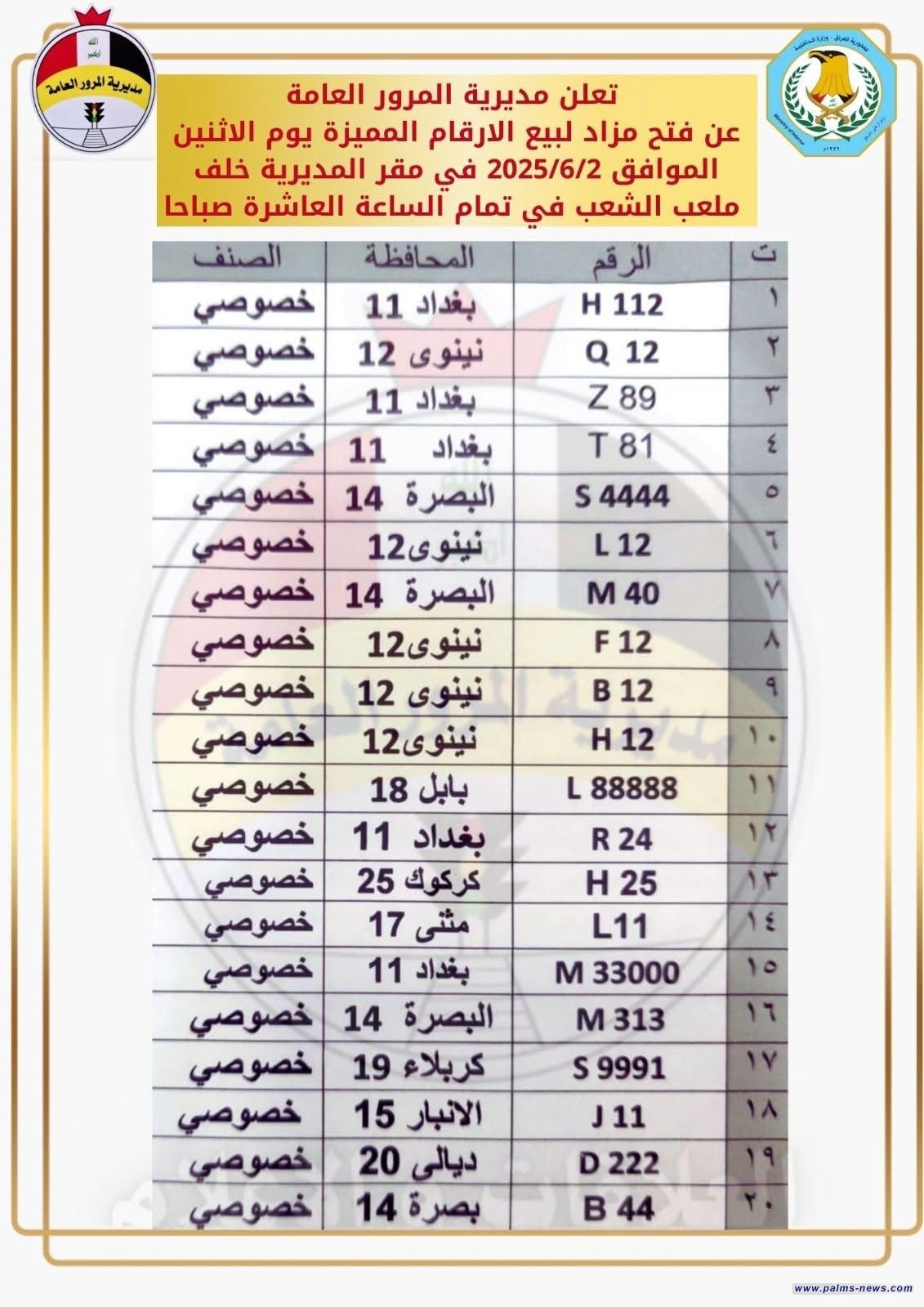 وذكرت المديرية في بيان تابعته وكالة نخيل عراقي ان "موعد فتح مزاد بيع الأرقام المميزة سيكون يوم الاثنين الموافق 2 حزيران 2025".