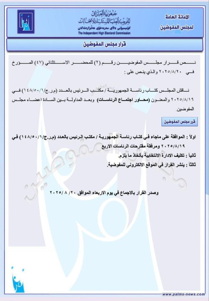 وجاء في وثيقة صادرة عن المفوضية وحصلت عليها "نخيل نيوز"أن مجلس المفوضين قرر الموافقة بالإجماع على ما جاء في كتاب رئيس الجمهورية بتاريخ 19 آب 2025، مرفقاً بمقترحات الرئاسات الأربع.