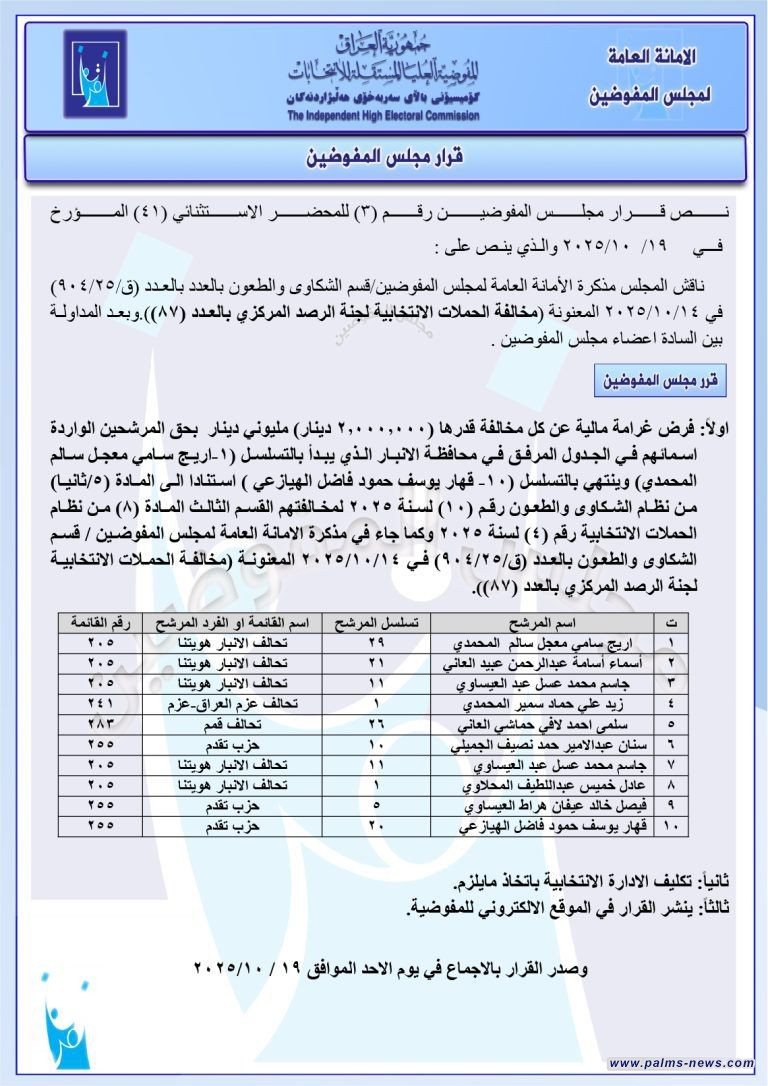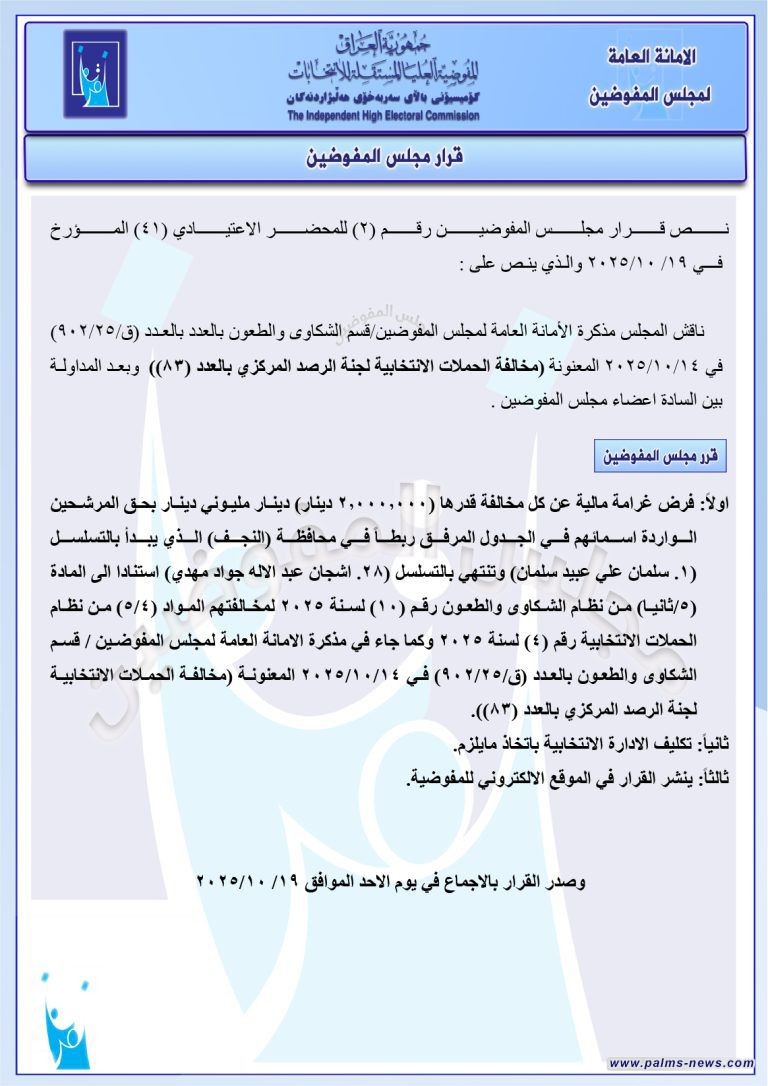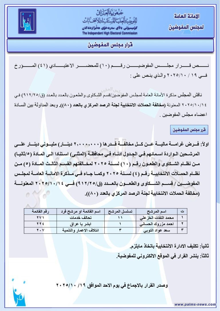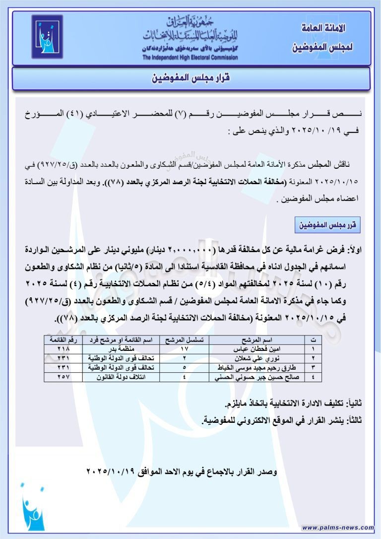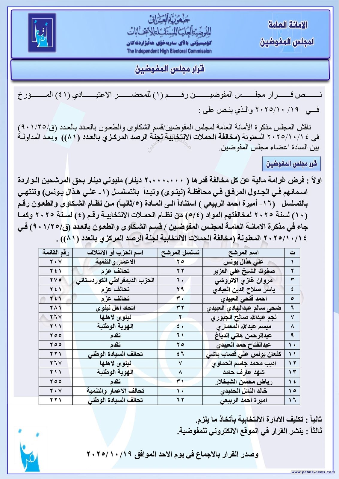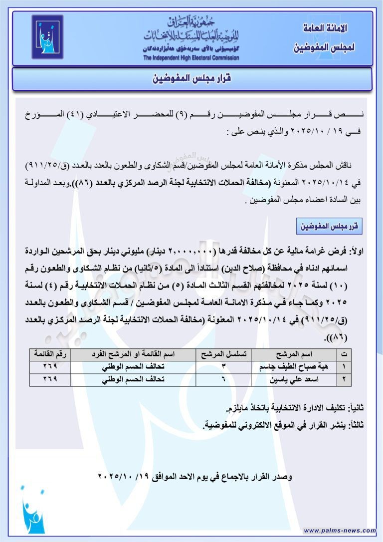 المفوضية تغرم 63 مرشحاً في 6 محافظات بسبب المخالفات الدعائية.