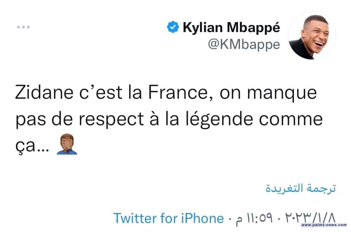 تداولت منصات التواصل الاجتماعي، اليوم الأثنين التاسع من يناي، تغريدة لنجم المنتخب الفرنسي كيليان مبابي، الذي كتب عبر حسابه على موقع التواصل الاجتماعي تويتر مدافعاً عن الأسطورة زيدان قائلاً "زيدان هو فرنسا، ويجب ألا نقلل من احترامه بهذه الطريقة"، مشيراً إلى أن زيدان أسطورة منتخب الديوك.