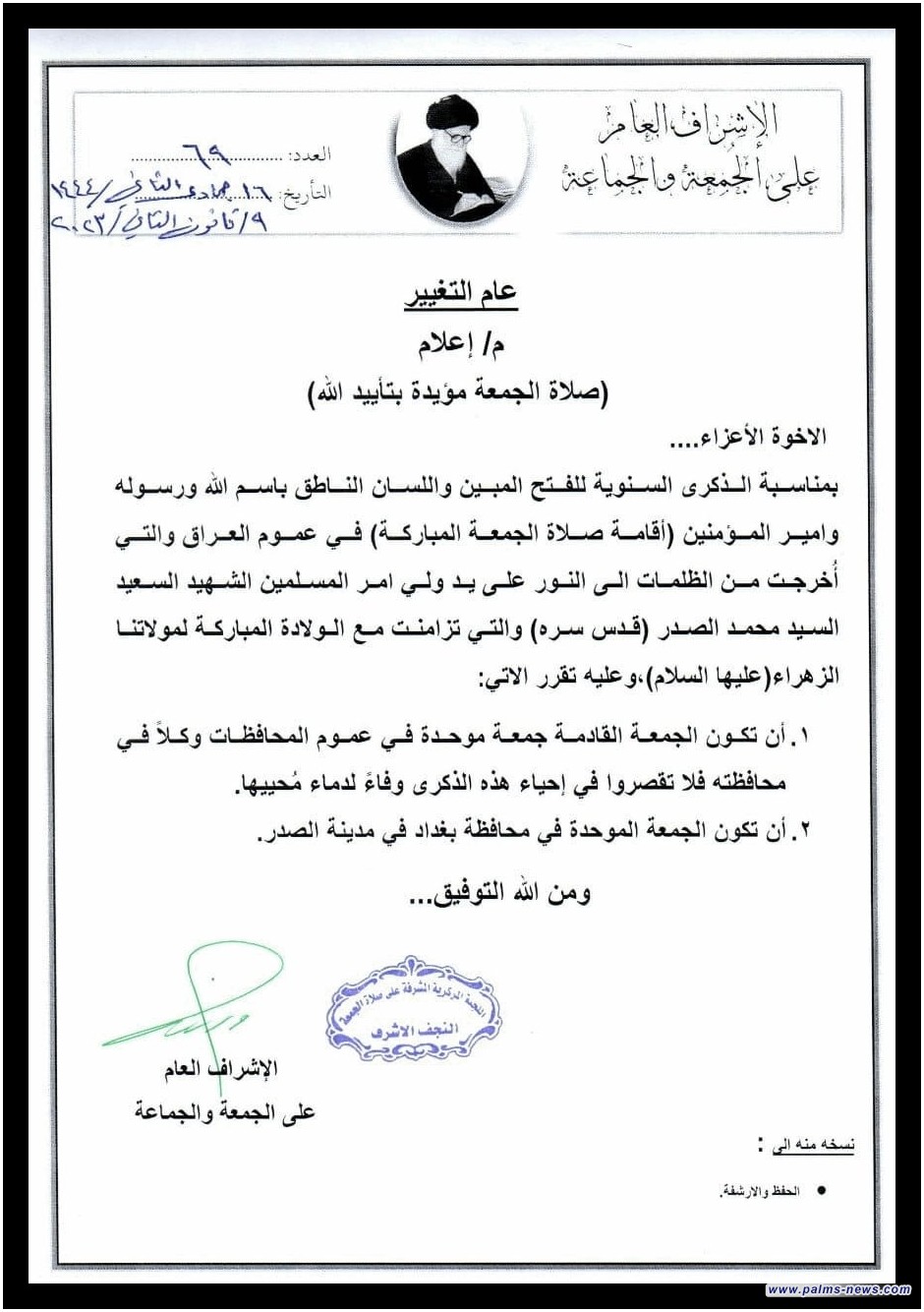 وبحسب وثيقة رسمية حصلت عليها نخيل نيوز موقعة بإسم الأشراف العام للجمعة والجماعة جاء فيها، أن هذه الدعوة تأتي "بمناسبة الذكرى السنوية للفتح المبين واللسان الناطق بسم الله ورسوله وأمير المؤمنين، إقامة صلاة الجمعة المباركة في عموم العراق والتي أخرجت من الظلمات الى النور، على يد ولي أمير المسلمين الشهيد السعيد محمد الصدر (قدس سره) والتي تزامنت مع الولاية المباركة لمولاتنا الزهراء (عليها السلام)".