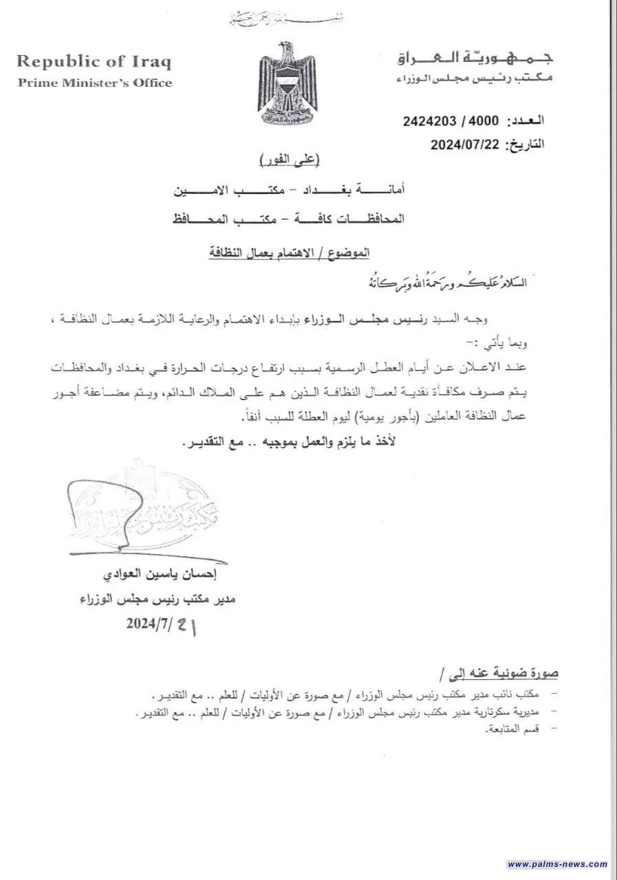 وجاء في كتاب صادر من مكتب رئيس الوزراء موجها إلى أمانه بغداد تلقت وكالة " نخيل نيوز" نسخة منه أن "رئيس مجلس الوزراء وجه بإبداء الاهتمام والرعاية اللازمة بعمال النظافة، وبما يأتي:-