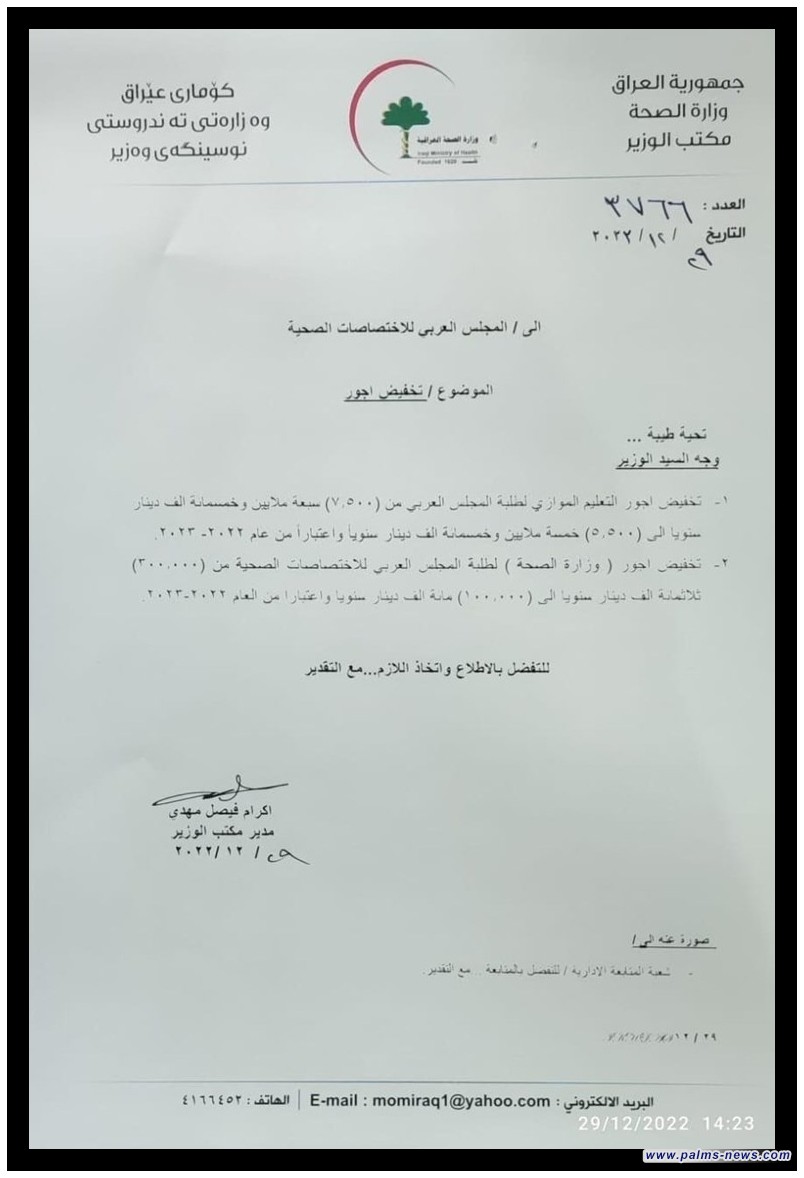 جاء هذا من خلال الوثيقة الصادرة من قبل المكتب الاعلامي لوزير الصحة، وجاء فيها : أن الحسناوي وجه بتخفيض أجور التعليم الموازي لطلبة المجلس العربي من (7500000) دينار الى (5500000) دينار سنوياً اعتباراً من العام 2022 - 2023.