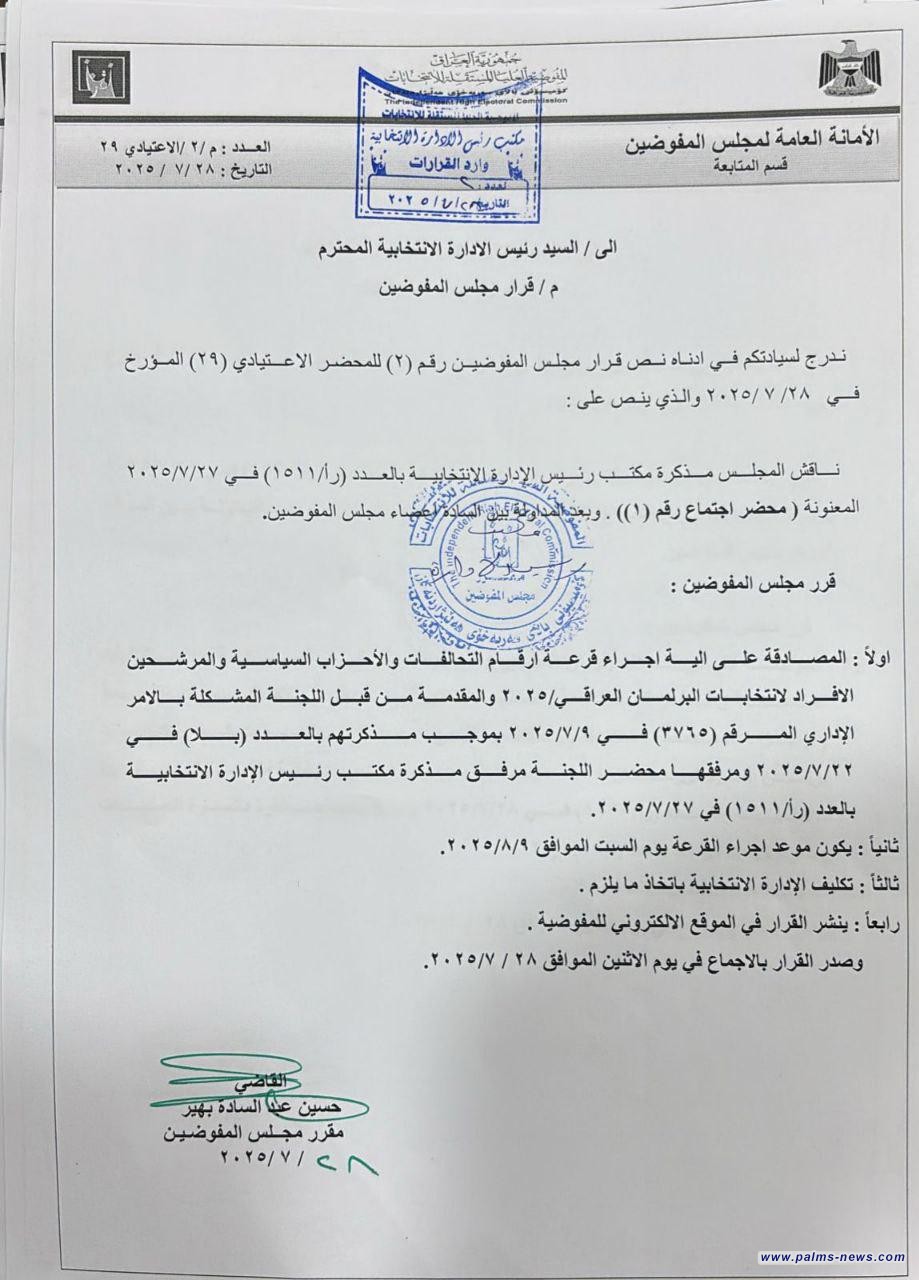 بالوثيقة : مفوضية الانتخاباتموعد إجراء قرعة أرقام التحالفات والأحزاب والمرشحين سيكون يوم 9 آب 2025.