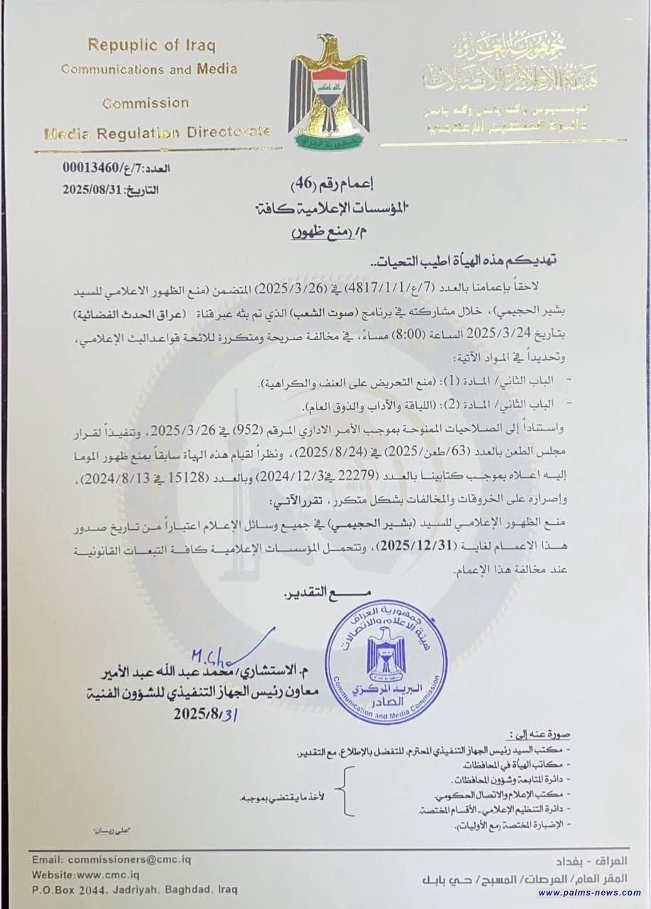 بالوثيقة : هيئة الاعلام والاتصالات تقرر منع المحلل السياسي بشير الحجيمي،مجدداً من الظهور بوسائل الإعلام.