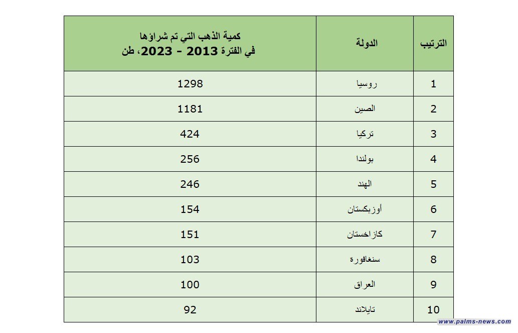 وفيما يلي تصنيف لأكثر الدول شراء للذهب في الفترة من 2013 حتى 2023: