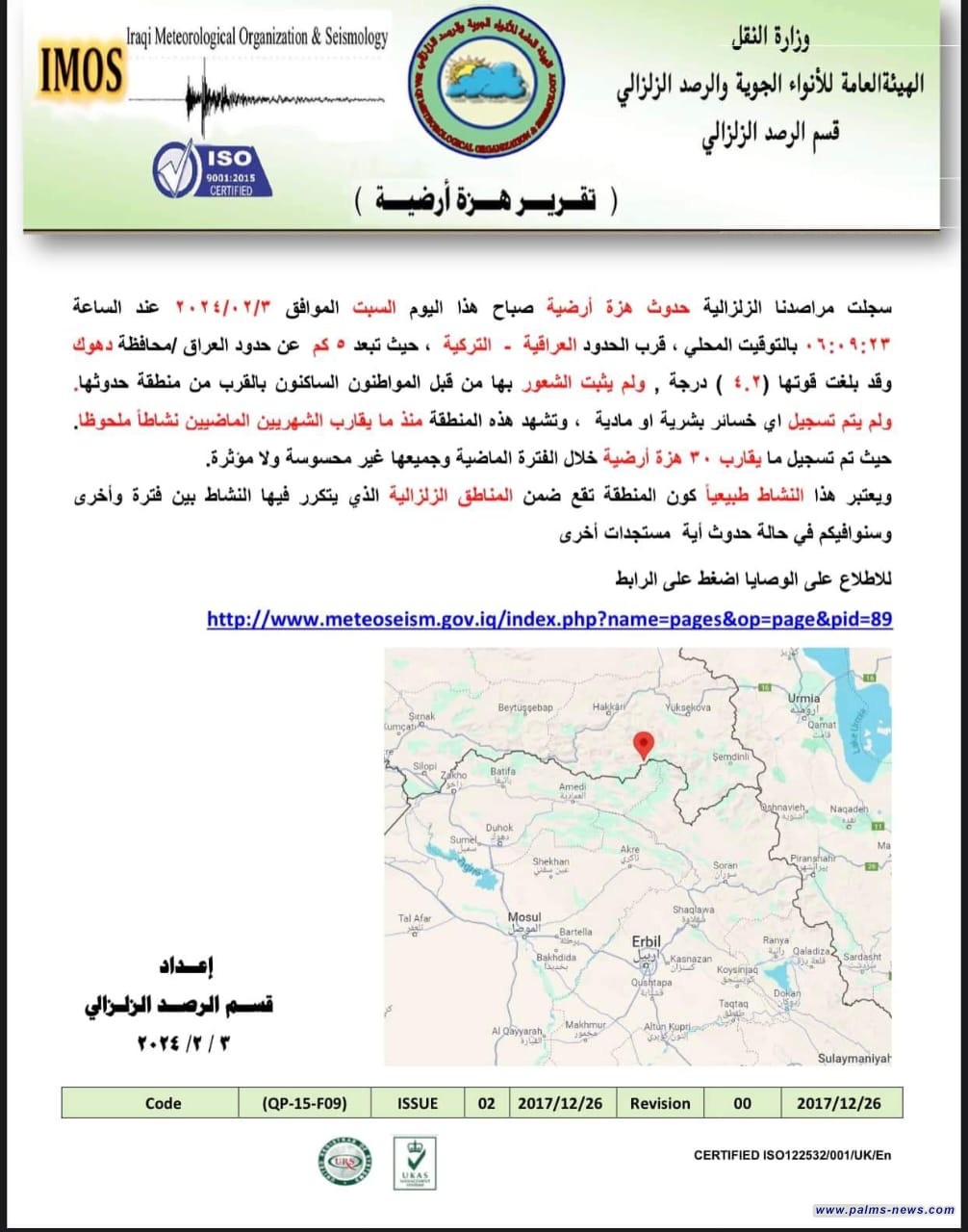 وبين تقرير المراصد،  أن الهزة الأرضية سجلت في تمام الساعة 06:09:23 بالتوقيت المحلي بلغت قوتها (4،2) درجة وتبعد (5 )كم عن حدود العراق محافظة دهوك.