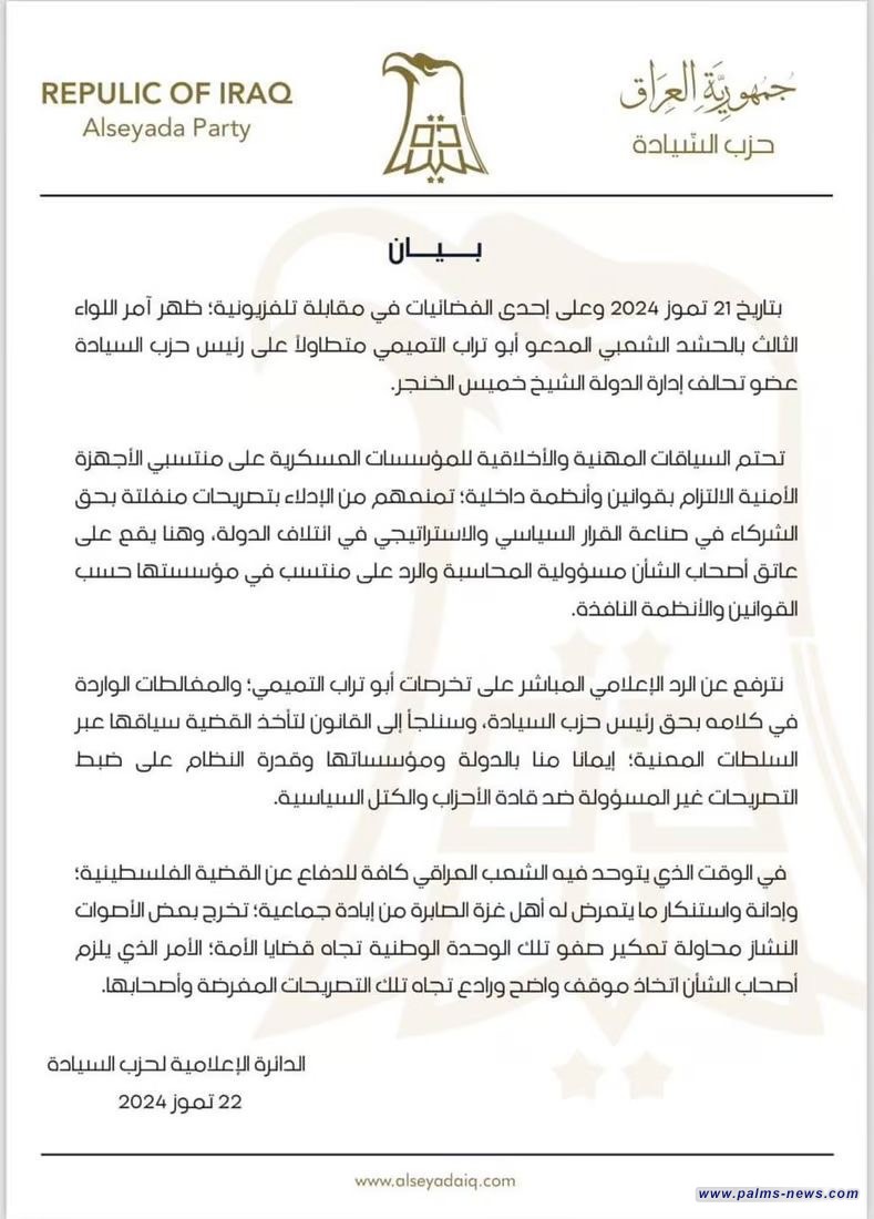 أكد حزب السيادة حسب وثيقة نشرها اليوم حصلت عليها وكالة " نخيل نيوز" اليوم الاثنين الثاني والعشرين من تموز، أنه بصدد اتخاذ الإجراءات القانونية ضد أمر اللواء الثالث في الحشد الشعبي أبو تراب التميمي بعد تصريحات خرج بها على وسائل الإعلام ضد رئيس الحزب خميس الخنجر.