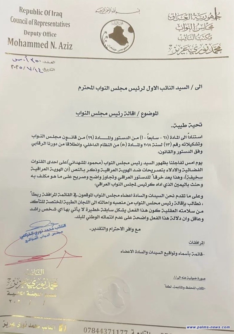 اطّلعت وكالة "نخيل نيوز" اليوم الإثنين، على وثيقة توضح طلب نيابي لجمع تواقيع برلمانية لإقالة رئيس البرلمان محمود المشهداني من منصبه.