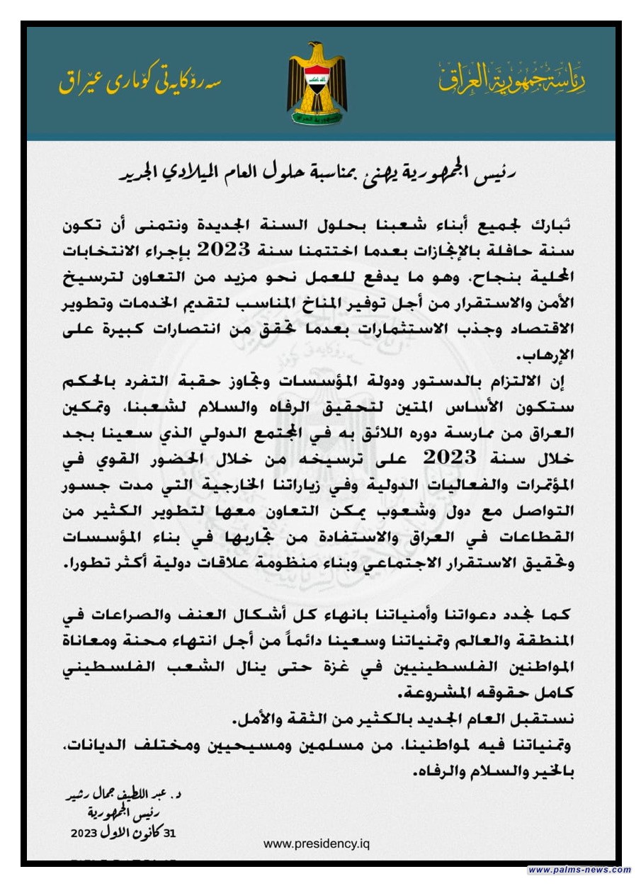 رئيس الجمهورية بمناسبة العام الجديد : نجدّد دعواتنا وأمنياتنا بانهاء كل أشكال العنف والصراعات في المنطقة والعالم.