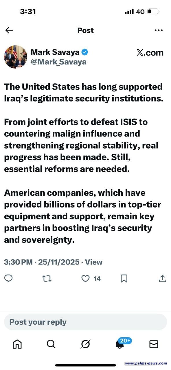 وقال سافايا، في تدوينة له على منصة "أكس"، "لقد دعمت الولايات المتحدة، منذ زمن طويل، المؤسسات الأمنية الشرعية في العراق".