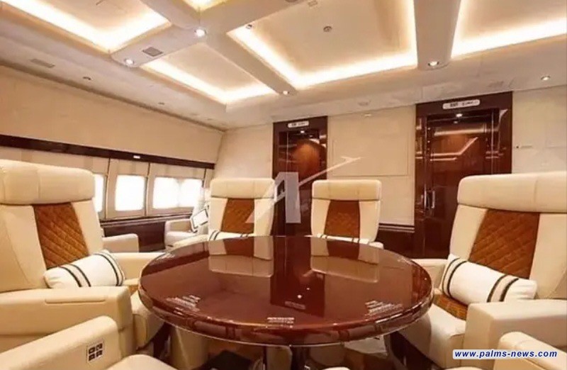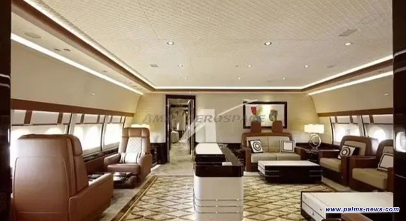 وتتميز الطائرة المجددة من الداخل على أجنحة نوم وسجاد ناعم وأرائك جلدية، ويتميز التصميم الداخلي بجدران وأثاث بلون ذهبي.