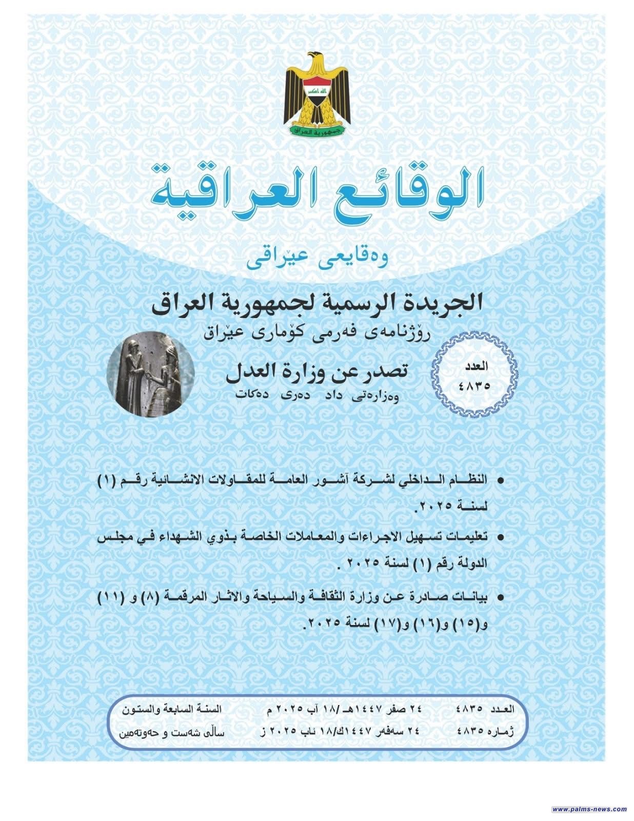 وقالت مدير عام دائرة الوقائع العراقية هيفاء شكر محمود، إن العدد تضمن النظام الداخلي لشركة آشور العامة للمقاولات الإنشائية رقم (1) لسنة 2025، إضافةً إلى تعليمات تسهيل الإجراءات والمعاملات الخاصة بذوي الشهداء في مجلس الدولة رقم (1) لسنة 2025.