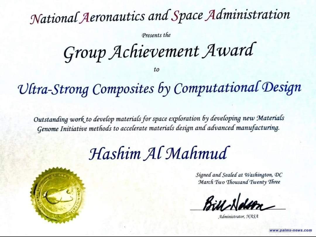 ونشرت السومرية وثيقة تبين، "حصول التدريسي في قسم الميكانيك //كلية الهندسة //جامعة الكوفة، هاشم ناجي عزوز المحمود على جائزة الانجاز العلمي المتميز والممنوحة من وكالة ناسا الفضائية".