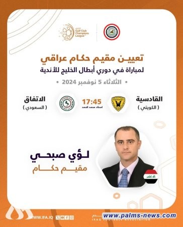 وذكر بيان لاتحاد الكرة تابعته "نخيل نيوز"، اليوم الخميس، أن" اتحاد كأس الخليج العربي كلف مقيم الحكام العراقي لؤي صبحي أديب لتقييم حُكام مباراة ناديي القادسية الكويتي والاتفاق السعودي ضمن دوري أبطالِ كأس الخليج للأندية بجولته الثانية التي ستقام في دولة الكويت في الخامس من شهر تشرين الثاني المُقبل".