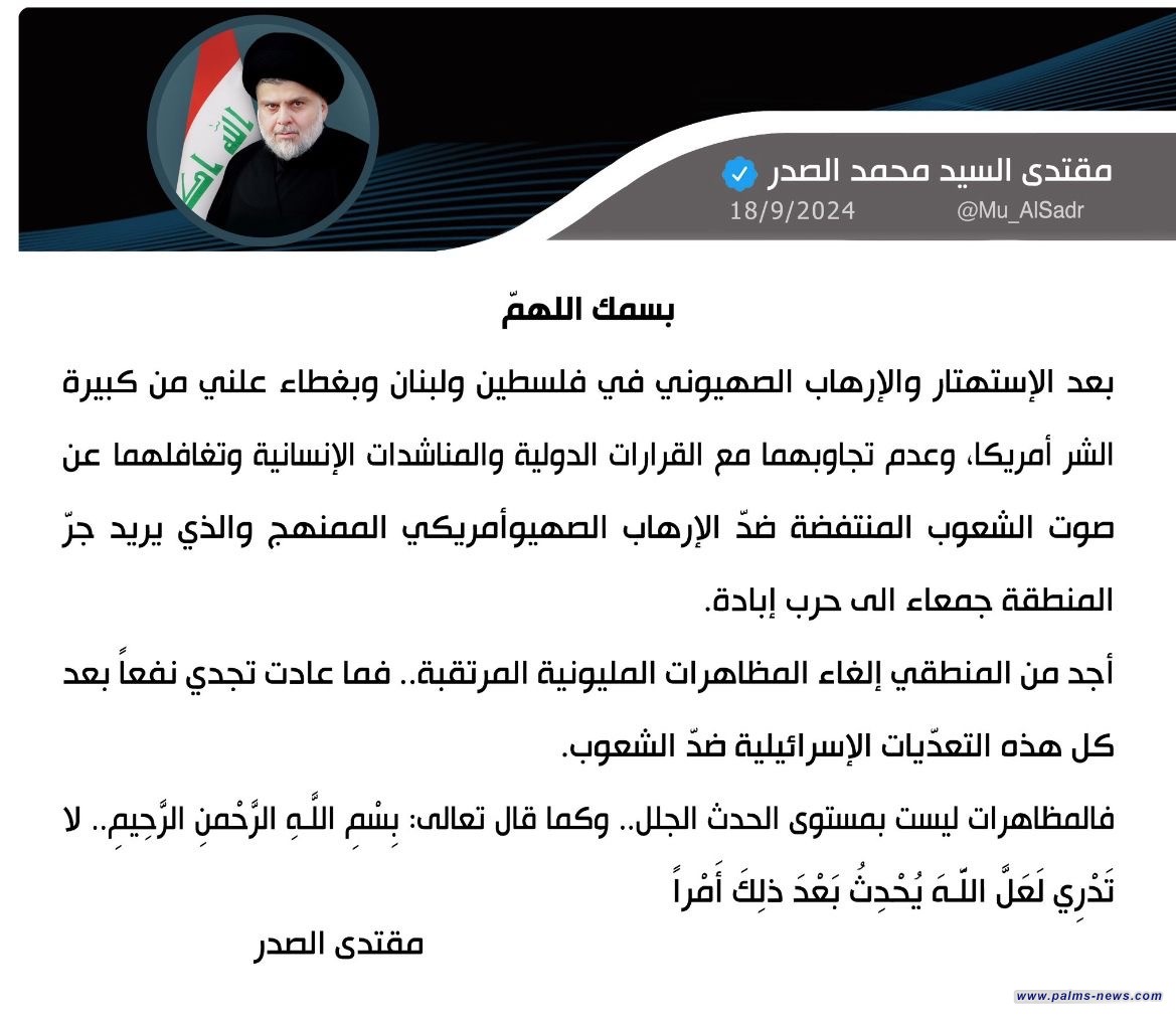 وقال السيد الصدر في تدوينة على ( X) تابعتها "نخيل نيوز": "بعد الإستهتار والإرهاب الصهيوني في فلسطين ولبنان وبغطاء علني من كبيرة الشر أمريكا، وعدم تجاوبهما مع القرارات الدولية والمناشدات الإنسانية وتغافلهما عن صوت الشعوب المنتفضة ضد الإرهاب الصهيوأمريكي الممنهج والذي يريد جرّ المنطقة جمعاء الى حرب إبادة. أجد من المنطقي إلغاء المظاهرات المليونية المرتقبة.. فما عادت تجدي نفعاً بعد كل هذه التعديات الإسرائيلية ضد الشعوب".