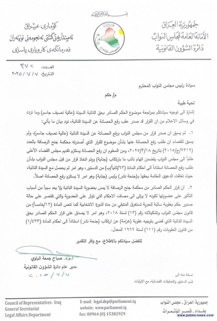 وبحسب الوثيقة التي تلقتها "نخيل نيوز" فأن "رفع الحصانة النيابية يشترط اتهام النائب بجناية، مع تقديم طلب رسمي من مجلس القضاء الأعلى إلى مجلس النواب، وهو إجراء لم يتم في هذه القضية"