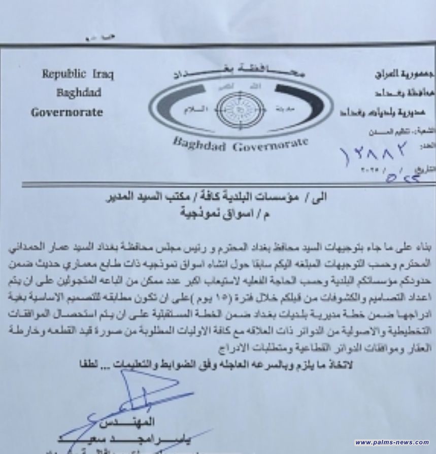 محافظة بغداد تخاطب بلديات العاصمة بإنشاء أسواق نموذجية