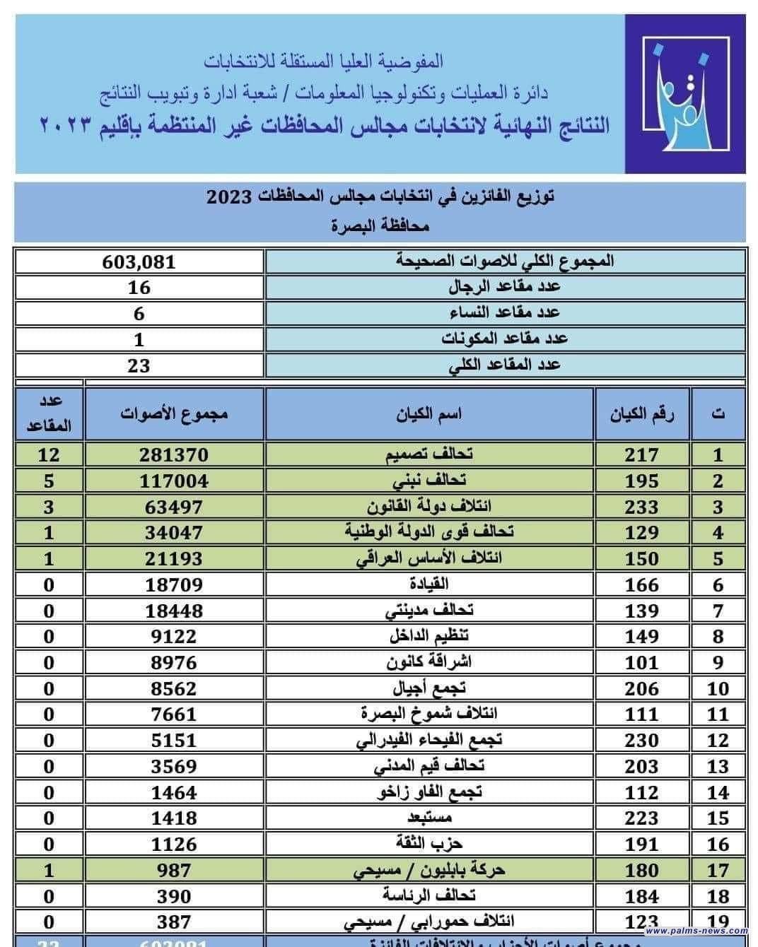 أعلنت المفوضية العليا المستقلة للانتخابات في العراق، اليوم الخميس الثامن والعشرين من ديسمبر، النتائج النهائية لانتخابات مجالس المحافظات 2023، فقد أظهرت النتائج النهائية بمحافظة كركوك، فوز تحالف كركوك قوتنا بالمركز الأول بـ(5) مقاعد، والتحالف العربي ثانياً ب(3) مقاعد، وجبهة تركمان العراق الموحد والحزب الديمقراطي الكوردستاني بمقعدين، وتحالف العروبة وحركة بابليون بمقعد واحد.