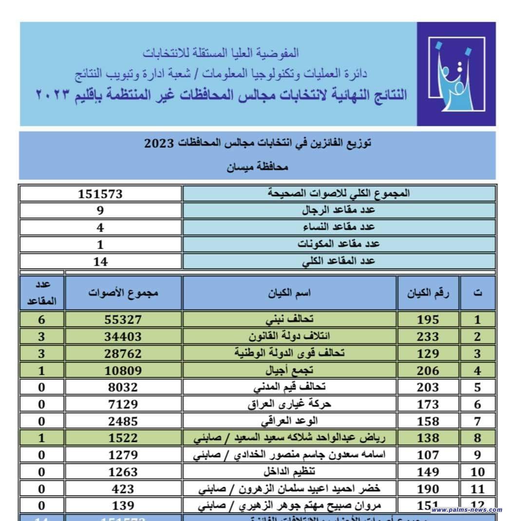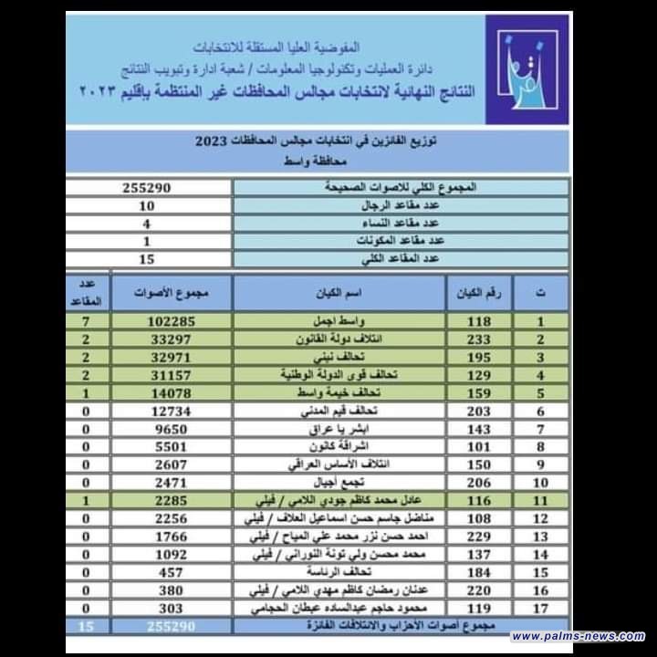 وأخيراً، شهدت محافظة واسط، فوز تحالف واسط أجمل بـ7 مقاعد، وائتلاف دولة القانون مقعدان، وتحالف نبني مقعدان، وتحالف قوى الدولة مقعدان، وتحالف خيمة واسط مقعد واحد.